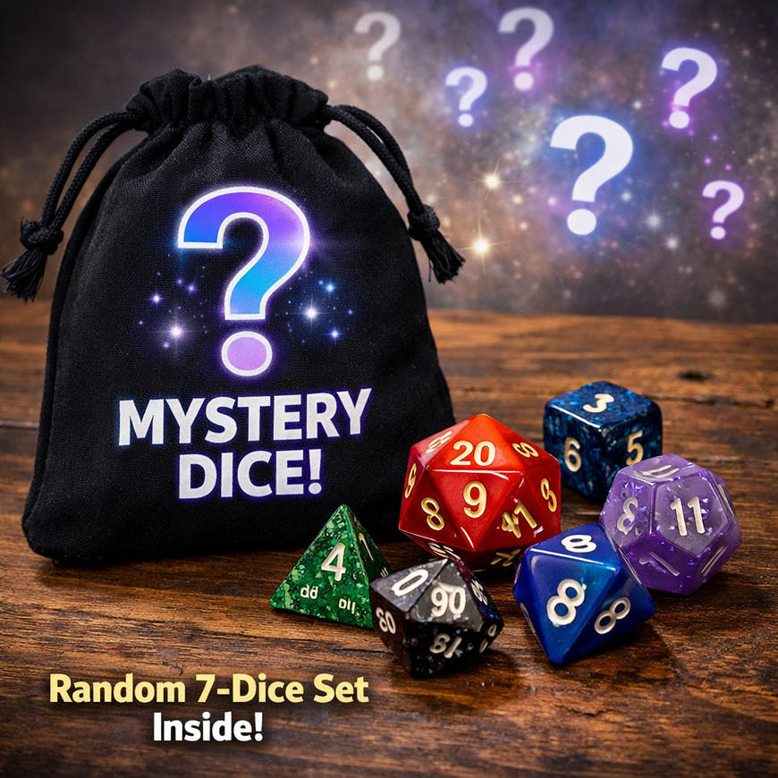Our Mystery Dice Set includes a complete 7-piece polyhedral dice set, suitable for Dungeons & Dragons, tabletop RPGs, and general dice collection. Each set comes packed in a mystery dice bag, with dice selected at random.